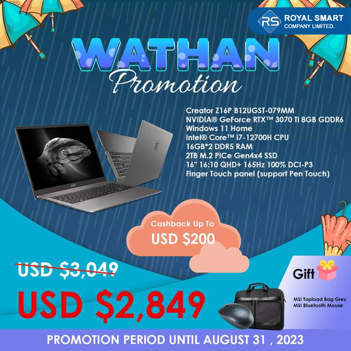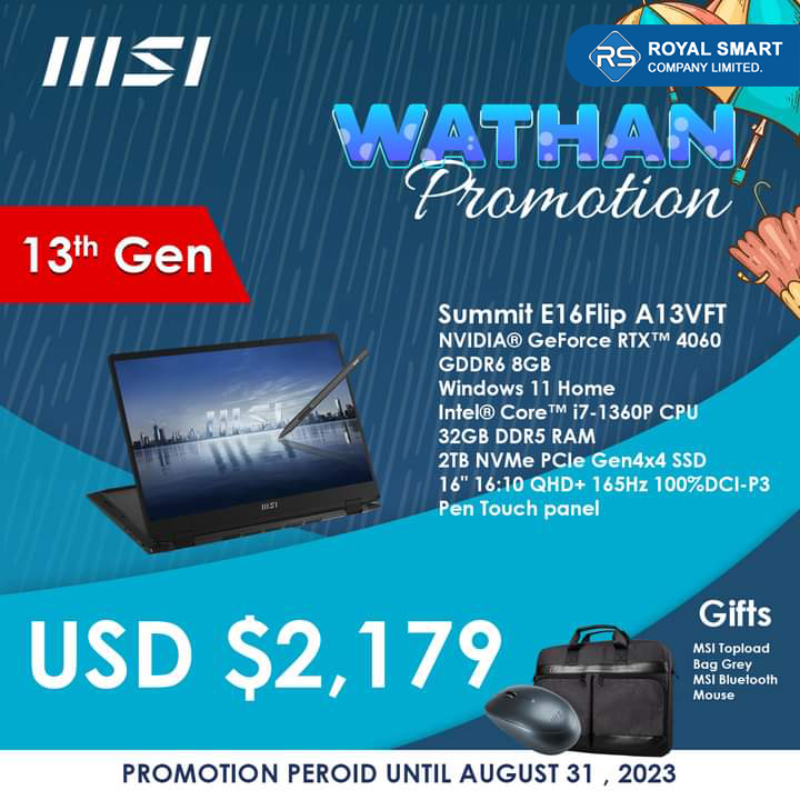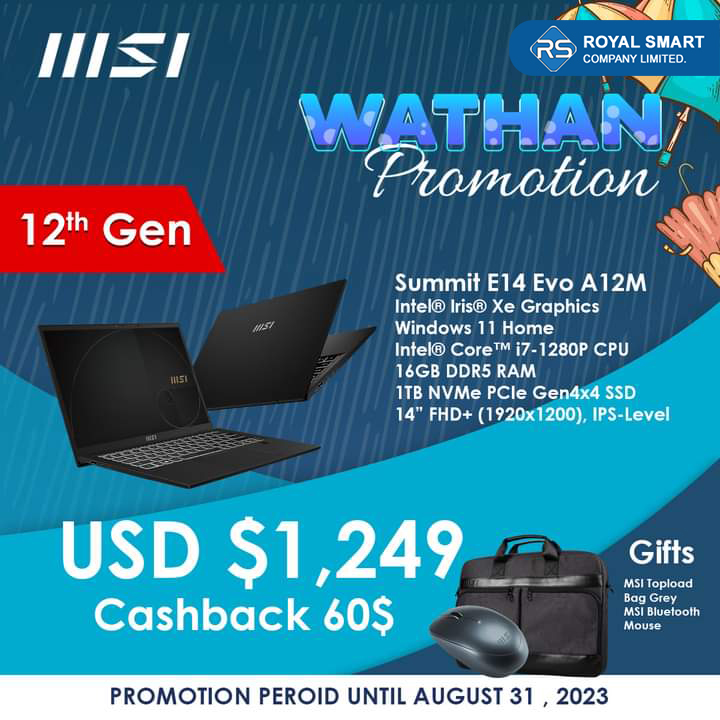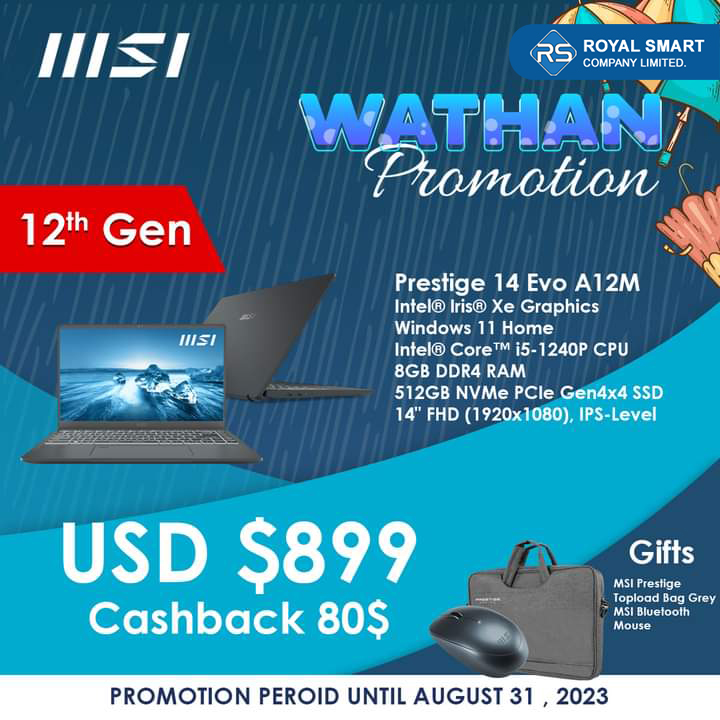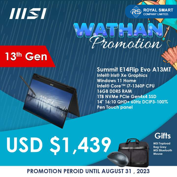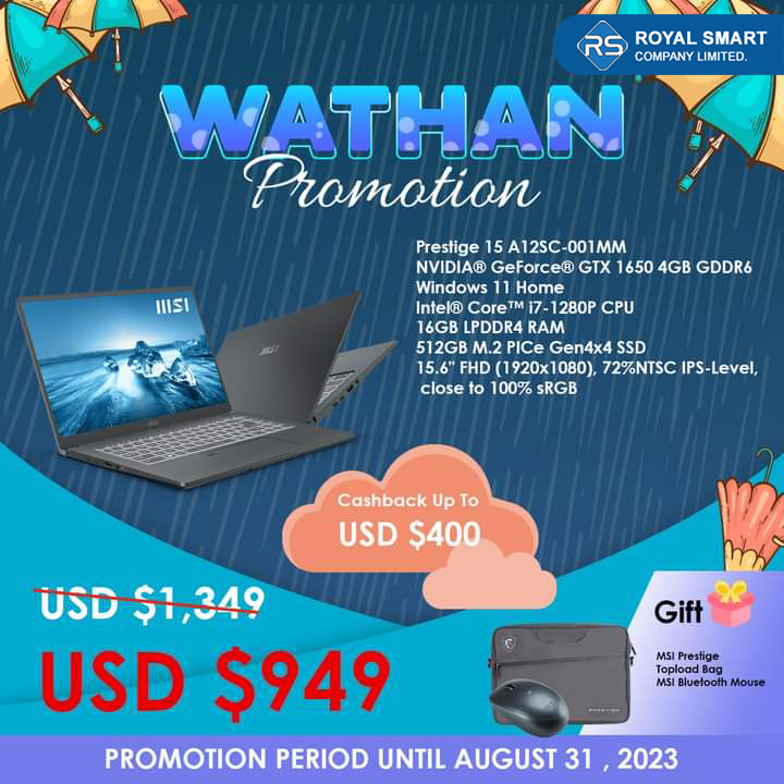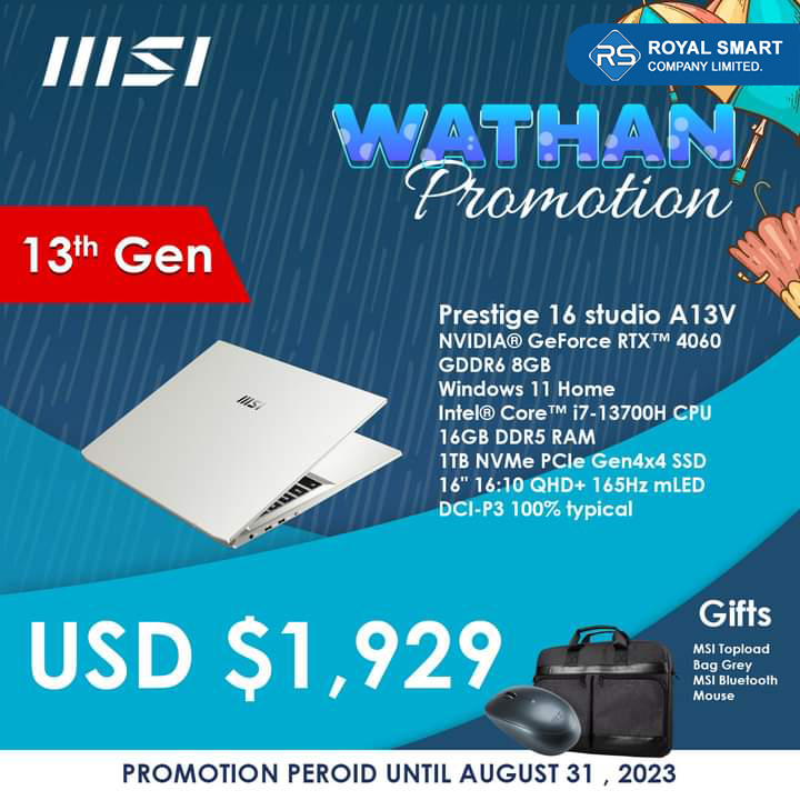 Video Editing သမားတွေ နှစ်ခြိုက်ကြတဲ့ MSI Prestige,Summi, Creator Series တွေကို အထူးသက်သာတဲ့ ဈေးနှုန်းတွေနဲ့ဩဂုတ်လကုန်ထိ ဝယ်ယူခွင့်ရရှိနိုင်မှာပါ။